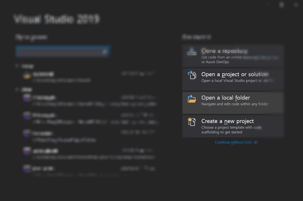 (2) 시작 화면에서 오른쪽의 "Open a local folder"를 선택합니다.