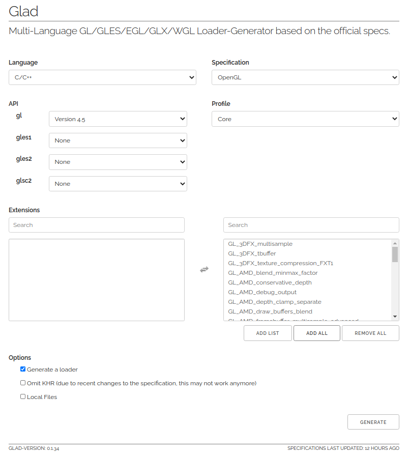 GLTutorial이라는 이름의 폴더를 만들었습니다. 이 폴더 안에 CMakeLists.txt라는 텍스트 파일을 만들고 아래 내용을 집어넣습니다.cmake_minimum_required(VERSION 3.17) project(GLTutorial) # Dependencies find_package(glfw3 REQUIRED) add_executable(${PROJECT_NAME} src/main.cpp src/glad.c ) target_include_directories(${PROJECT_NAME} PRIVATE "${CMAKE_SOURCE_DIR}/include") target_link_libraries(${PROJECT_NAME} glfw ${CMAKE_DL_LIBS}) set_target_properties(${PROJECT_NAME} PROPERTIES CXX_STANDARD 17 CXX_EXTENSIONS OFF )4. OpenGL 4.5 라이브러리 자체는 Windows 10 이상 또는 최신 버전 드라이버가 설치되어 있는 리눅스라면 기본적으로 제공해주지만, 개발을 위해서는 헤더 파일과 OpenGL API의 함수의 주소들을 불러와주는 로더가 필요합니다. 이를 위해 OpenGL 헤더 파일과 로더를 생성해주는 glad.dav1d.de 라는 사이트에 들어갑시다. 사이트에 들어가면 Language - C/C++, Specification - OpenGL, API - gl - Version 4.5, Profile - Core, 그리고 Extensions에서 "Add All" 버튼을 눌러 모든 확장 기능을 추가해 줍시다. 이렇게 하면 아래 그림과 같은 화면이 나와야 합니다. Options에는 "Generate a loader" 옵션만 선택된 채로 두고 Generate를 누릅니다.